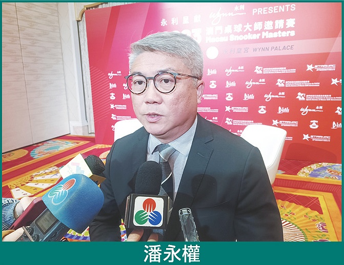 潘永權在出席並主禮25日在永利皇宮宴會廳舉行的“2023澳門桌球大師邀請賽”的開球禮後,接受採訪時表示,今年在6家綜合度假休閒企業的共同或分別的參與下,各體育活動為本澳的體育旅遊經濟發展均取得了顯著的成效。正如是次舉行的斯諾克桌球賽,透過國際高水平的頂尖球手來澳門比賽,吸引了很多世界各地的球迷來到澳門入場觀賽。接下來澳門會舉辦更多各方各面的大型體育活動,吸引更多來自世界各地的旅客。