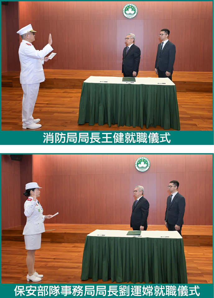 黃司長又表示,消防局和澳門保安部隊事務局都是保安範疇的重要部門,肩負崇高使命,承擔關鍵職能。王健局長和劉運嫦局長期服務於保安部隊及保安部門,具有豐富的管理經驗、優秀的專業素養、堅定的職業操守。任命兩位局長,既是對他們過往成績的全面認可,也是對消防局、澳門保安部隊事務局未來發展的高度重視和熱切期許。