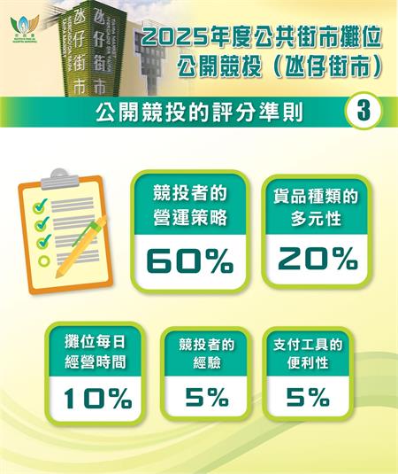 氹仔街市攤位公開競投共推出20個攤位,在維持街市地面層售賣鮮活食品及傳統百貨的同時,推出一樓19個輕食及文創類攤位,以及天台1個咖啡茶座攤位作公開競投。市政署冀藉公開競投吸納年青及具創新經營理念的經營者,為氹仔街市引進社會一直倡議的“美食 + 文創”元素,共同推動傳統街市轉型。現時,氹仔街市內設有諮詢櫃位,方便有意競投者實地了解競投攤位之間隔及場地整體佈局。