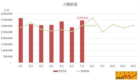 【本報訊】統計暨普查局資料顯示,2025年7月入境旅客共3,458,366人次,按年上升14.5%。不過夜旅客(1,980,732人次)與留宿旅客(1,477,634人次)較去年同期分別上升24.1%及3.7%。旅客平均逗留時間為1.2日,按年持平;留宿旅客(2.4日)維持不變,不過夜旅客(0.2日)則減少0.1日。