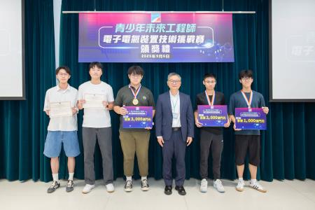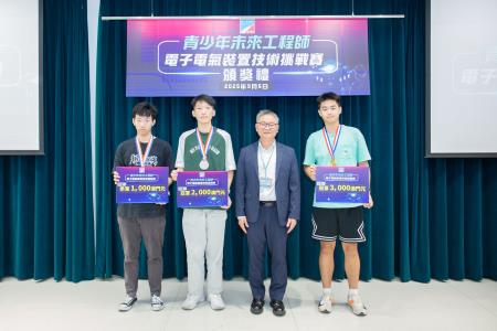 陳元童局長與電子技術項目冠、亞、季軍合照(左起:季軍袁麒杰、亞軍鄭錦俊、冠軍都宗陽)