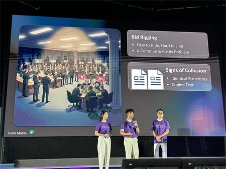 【本報訊】由澳門青年岑嘉洛、雷雅曦及蔡培鈞組成的澳門代表隊,日前前往香港出戰由聯合國毒品和犯罪問題辦公室、國際反貪局聯合會及香港廉政公署合辦的“亞洲青年反貪程式設計馬拉松”總決賽,憑他們設計的AI智慧型公共採購分析平台防貪原型方案,在14個國家和地區的參賽隊伍中脫穎而出,勇奪國際賽冠軍及多個獎項。澳門廉署表示,將繼續積極配合國家及特區重視青年培養的方向,鼓勵澳門青年以創新思維參與國家及澳門的廉政建設,讓澳門青年在國際舞台上展現才華。