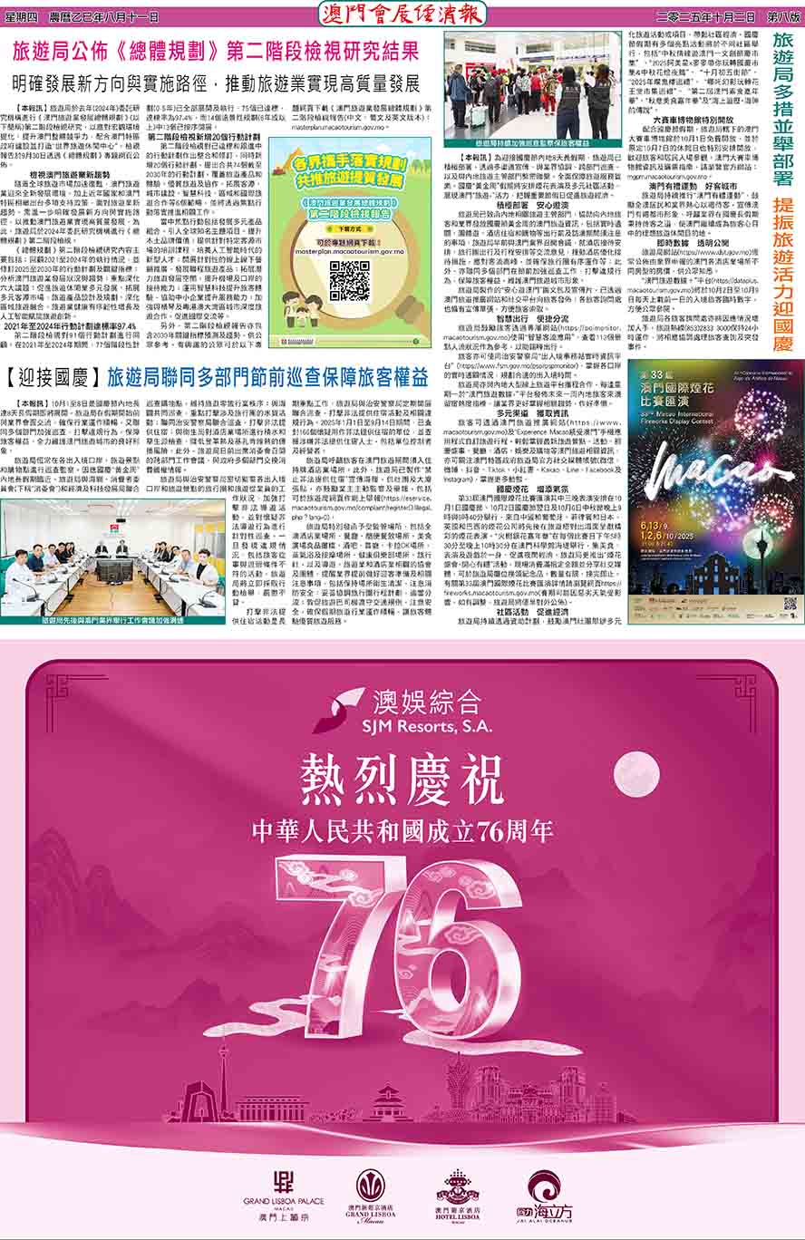 【本報訊】旅遊局於去年(2024年)委託研究機構進行《澳門旅遊業發展總體規劃》(以下簡稱)第二階段檢視研究,以應對宏觀環境變化、提升澳門整體競爭力,配合澳門特區政府建設並打造“世界旅遊休閒中心”。檢視報告於9月30日透過《總體規劃》專題網頁公佈。