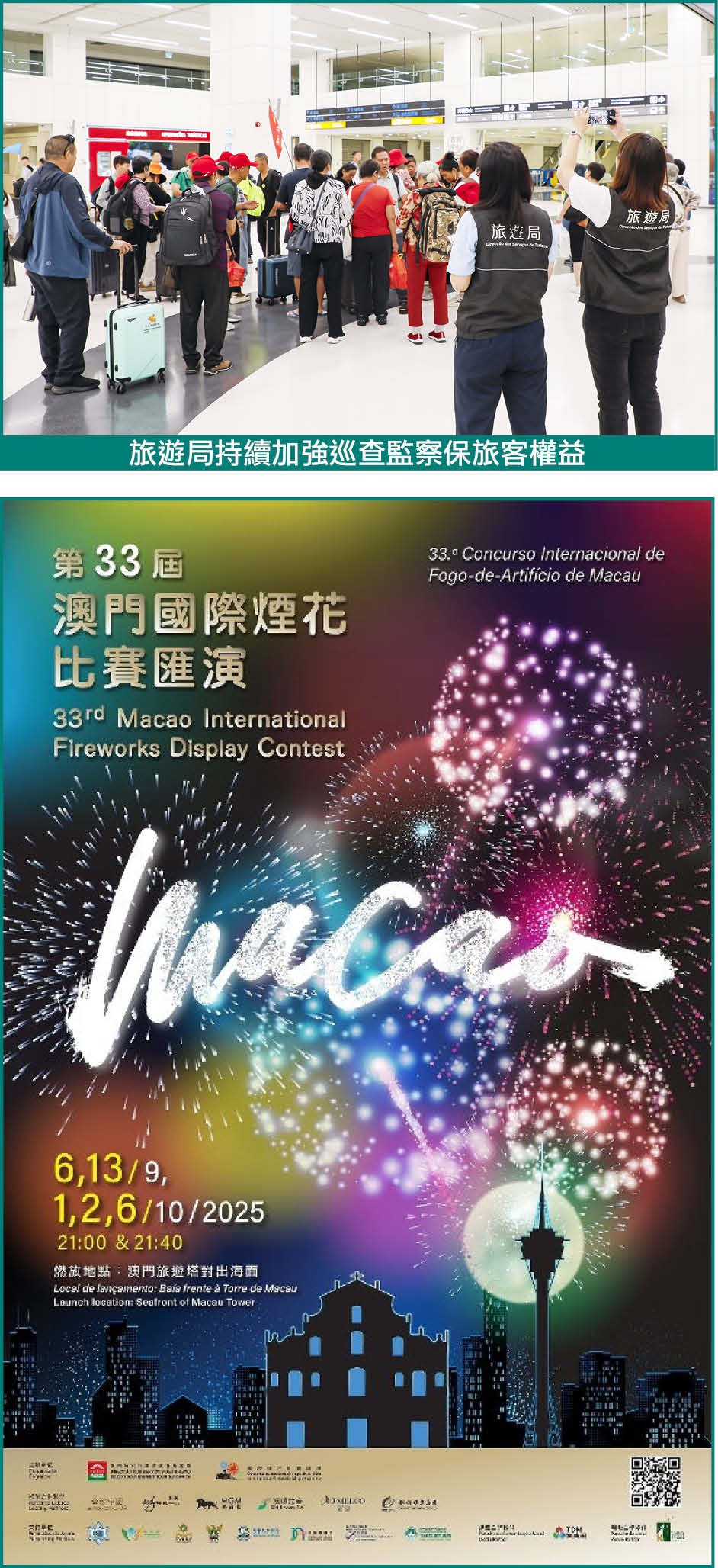 第33屆澳門國際煙花比賽匯演其中三晚表演安排在10月1日國慶節、10月2日國慶節翌日及10月6日中秋節晚上9時與9時40分舉行,來自中國和葡萄牙、菲律賓和日本、英國和巴西的煙花公司將先後在旅遊塔對出海面呈獻精彩的煙花表演。“火樹銀花嘉年華”在每個比賽日下午5時30分至晚上10時30分在澳門科學館海堤舉行,集美食、表演及遊戲於一身,促進夜間經濟。旅遊局更推出“煙花盛會・開心有禮”活動,現場消費滿指定金額並分享社交媒體,可於旅遊局攤位換領紀念品。數量有限,換完即止。有關第33屆澳門國際煙花比賽匯演詳情請瀏覽網頁https://fireworks.macaotourism.gov.mo(賽期可能因惡劣天氣受影響,如有調整,旅遊局將儘早對外公佈)。