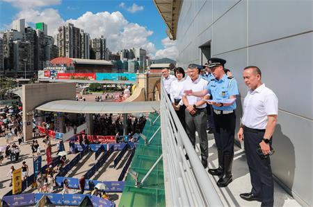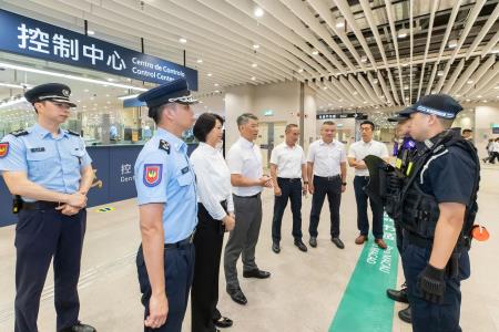 為深入了解各前線部門在國慶節期間的工作執行情況,昨日(3日),警察總局局長梁文昌率治安警察局局長吳錦華、保安部隊事務局局長劉運嫦、警察總局局長助理魏瑞斌、治安警察局副局長梁慶康、副局長伍素萍及相關部門主管,先後視察關閘、青茂及橫琴口岸,視察節假日人流及旅客通關情況;亦親臨澳門關前街及氹仔舊城區設置的臨時行人專用區,實地考察市面人流及相關措施的執行情況,並就各項警務部署作出指示。