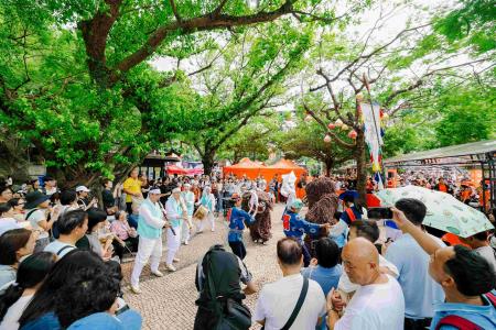 中、日、韓三地獅藝團隊在媽閣廟前地表演與觀眾近距離互動