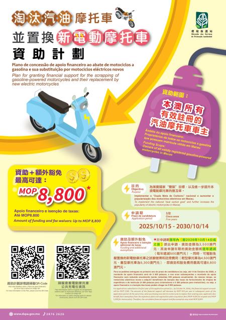 《淘汰汽油摩托車並置換新電動摩托車資助計劃》是配合國家實現“雙碳”目標的重要舉措,亦是特區政府本年度施政方針和“澳門電動車推廣計劃”的重點工作,申請期由2025年10月15日至2030年10月14日,為期五年。資助對象範圍擴大至所有在澳門特別行政區具備有效註冊的重型或輕型汽油電單車車主,但不包括在2025年10月6日或之後已被取消註冊且其後重新註冊的電單車車主,以及結欠澳門特別行政區債務的電單車車主。
