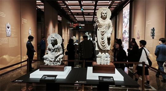 “絲路”展覽不僅特邀甘肅省博物館藏銅車馬儀仗俑隊、故宮博物院藏雍正款藍色玻璃八棱瓶、敘利亞大馬士革國家博物館藏瓷瓶、日本平山郁夫絲綢之路美術館藏犍陀羅佛像等珍貴展品現場展出,還與音樂家譚盾復原的鳳首箜篌、敦煌藝術四代傳承者的壁畫摹本以及數位藝術同置一廳,讓古老的絲路遺珍在聲音、光影、色彩與互動中“活起來”,呈獻三大亮點闡釋不同文明交流互鑒的當代價值: