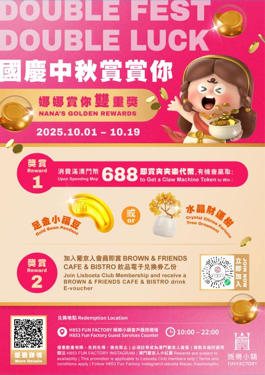 除美食佳餚外,澳門葡京人H853 Fun Factory娛樂小鎮推出“國慶中秋賞賞你 娜娜賞你雙重獎”。由即日起至2025年10月19日,訪客凡消費滿澳門幣688元,即可獲贈“夾夾樂”代幣一枚,參與遊戲即有機會贏取“水晶財運樹”或“足金小福豆”,為節日添上驚喜。
