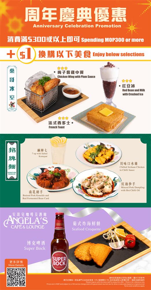 為答謝訪客由開業至今一直的支持,由10月10日至31日期間,訪客於“燊哥冰室”、“招牌麵”及“安琪兒咖啡及酒廊”單次消費滿澳門幣300元,即可享以一元驚喜價選購將於推出“周年慶典優惠”之限定多款招牌小食與特色飲品,如梅子醬雞中翼、法式西多士、川味口水雞、南乳豬手、紅油抄手、葡式炸海鮮餅、博克啤酒、鹹檸七、紅豆冰,一同共慶誌慶。