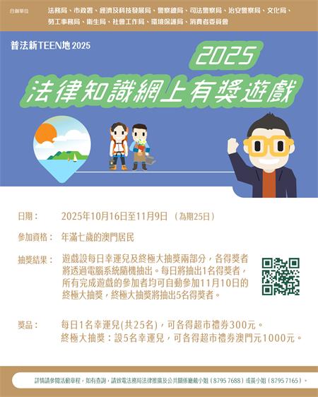【本報訊】為推廣青少年法治教育,法務局與市政署、經濟及科技發展局、警察總局、司法警察局、治安警察局、文化局、勞工事務局、衛生局、社會工作局、環境保護局及消費者委員會共12個政府部門合辦“普法新TEEN地青少年法律推廣月活動”,並由即日起至11月9日期間推出法律知識網上有獎遊戲。是次活動對象為年滿七歲的澳門居民,旨在以寓學習於娛樂的方式,透過網上問答遊戲提升青少年及公眾學習法律的興趣,加深他們對《憲法》、《基本法》、《維護國家安全法》、《道路交通法》、《預防及控制未成年人飲用酒精飲料制度》、《消費者權益保護法》、《動物防疫法》、認識國家象徵和標誌等法律法規的認識。
