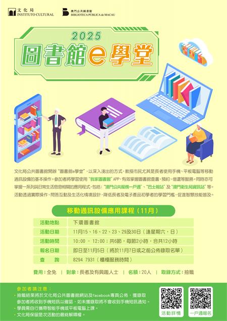 新一期“圖書館e學堂”將於111530日逢周六、日上午10時至12時在下環圖書館舉行,活動共6節,將由導師教授手機及平板電腦等移動裝置的基本設定與日常操作,並介紹文化局公共圖書館的“我家圖書館”流動應用程式及其電子服務功能。同時,亦會教導多款實用應用程式的應用,例如“澳門公共服務一戶通”“巴士報站”“澳門衛生局資訊站”等。活動透過實際操作、問答互動及生活化情境設計,降低長者及電子產品初學者的學習門檻,市民輕鬆掌握使用公共電子服務的能力。