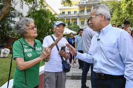 接着,岑浩輝進入禮賓樓,繼續與參觀人士互動和合影,感謝市民踴躍參與及支持開放日活動,又歡迎旅客來澳遊覽,交談中氣氛融洽。岑浩輝表示,一年一度的開放日,讓公眾加深對政府總部的認識,並對特區政府舉辦官式活動的場所有更多了解,更重要是藉此拉近市民與政府之間的距離,增進相互關係,達至攜手同行的理念,他期待兩天的開放日迎來更多訪客。