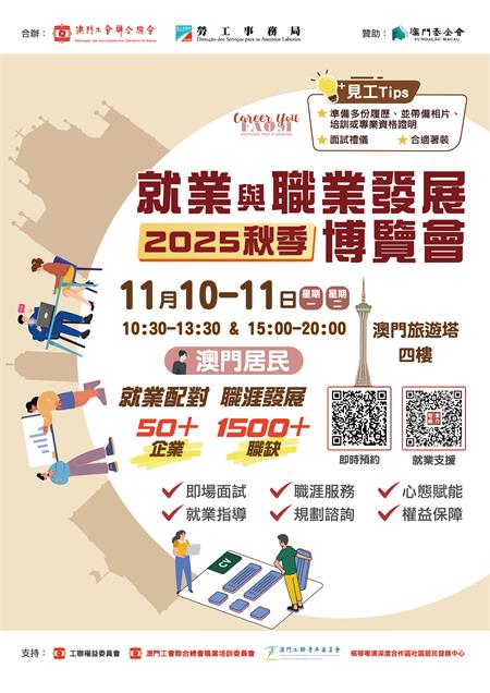 在11月10日至11日博覽會期間,將於澳門旅遊塔會展娛樂中心開設多場行業講座及職涯工作坊,屆時會邀請資深行業代表、專業培訓導師及生涯規劃師等擔任講者,分享最新市場動態,並透過小組互動形式引導求職者探索自我及發掘自身潛能。現場亦設有職工就業支援服務路演專區,提供一對一職涯規劃、就業指導、崗位諮詢、勞動權益保障等服務,協助有就業需求的澳門居民提供全方位就業支援,為面試作好充份準備。
