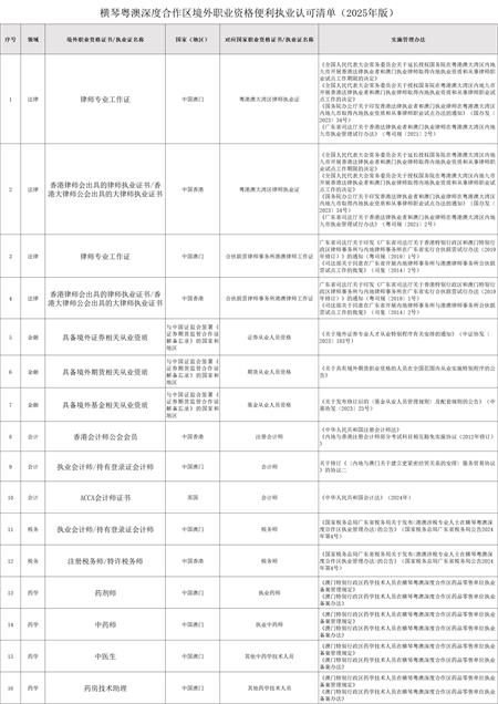 【本報訊】近日,橫琴粵澳深度合作區經濟發展局發佈《橫琴粵澳深度合作區境外職業資格便利執業認可清單(2025年版)》(下稱《清單》),允許持有《清單》內境外職業資格的專業人員按照相關實施辦法,通過執業備案、登記、專業科目免考等途徑,在合作區提供專業服務。《清單》的發佈是合作區與澳門規則銜接的重要體現,助推人才創新要素跨境流動,為琴澳一體化發展提供人才支撐。