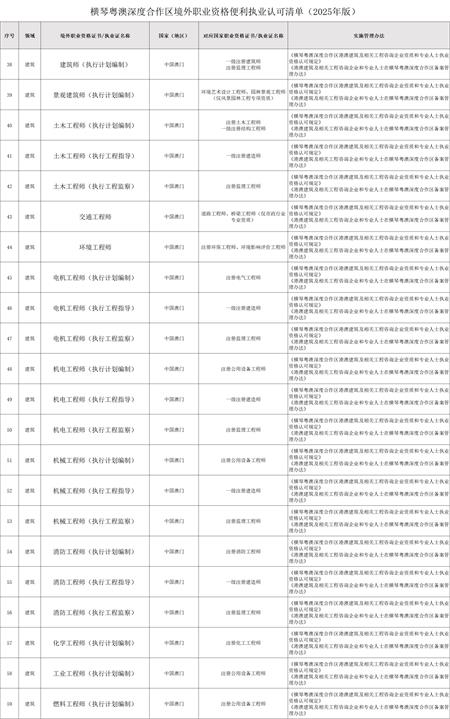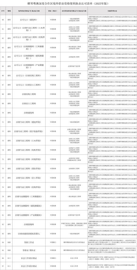 《清單》涵蓋法律、金融、會計、稅務、藥學、醫療衛生、建築、規劃、旅遊、社工10個領域,包括律師、證券從業人員、會計師、稅務師、土木工程師等87項職業資格,其中有49項為澳門職業資格,進一步拓寬了澳門專業人士在合作區的執業空間。