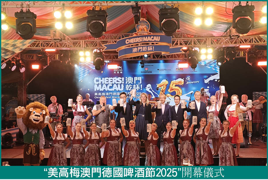【本報訊】美高梅年度品牌派對盛事“美高梅澳門德國啤酒節2025”10月24日於美獅美高梅盛大開幕,即日起至11月2日,為澳門帶來正宗日耳曼風情的啤酒派對盛典,歡迎市民和旅客齊聚美獅美高梅舉杯暢歡,品嚐琳琅滿目的德國傳統美酒佳餚,盡情感受“創意城市美食之都”的非凡魅力! 美高梅中國控股有限公司總裁及執行董事馮小峰、德國駐香港總領事館總領事寶德雅、旅遊局代局長程衛東、澳門中聯辦經濟部處長孫耀華、澳門德國商會會長袁松山出席開幕盛典。 馮小峰表示,美高梅澳門德國啤酒節邁入十五周年,今年將迎來第20萬位賓客,這不僅是里程碑,更體現美高梅長期深耕澳門文旅領域的成果。期望透過這個活動,實現‘美食、旅遊、文化、節慶和娛樂’五者交織的聯動效應,持續為澳門注入活力,吸引更多市民與旅客參與其中。 美高梅今年更再次邀請從慕尼黑遠道而來的Hogl Fun Band樂隊來澳表演助慶,與觀眾一起高歌“美高梅澳門德國啤酒節”的經典原創主題曲《你好,Macau!》。活動並重現慕尼黑啤酒節的經典氛圍—巨型主題帳篷、傳統木製長桌椅,以及身穿德國民族服飾的表演者,讓觀眾彷如親赴德國感受日耳曼風情啤酒慶典。 適逢啤酒節迎來15周年,美高梅於會場特設啤酒節主題拍貼機,邀請大家合照留念。今年首設“最佳服飾獎”・鼓勵實客穿上節慶主題服飾,沉浸式投入節日狂歡。場內亦設有嘉年華遊戲攤位及適合小朋友的活動,讓一家大小都能參與其中,共享節慶氛圍。