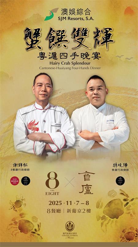 【本報訊】澳娛綜合度假股份有限公司(“澳娛綜合”)旗下位於澳門新葡京酒店、榮獲米芝蓮二星及黑珍珠二鑽殊榮的“8餐廳”,將與上海黑珍珠一鑽餐廳“食廬”攜手合作,於11月7日至8日推出“蟹饌雙輝:粵滬四手晚宴”。秋意盎然的蟹宴菜單由兩位餐廳總廚聯手設計,採用頂級大閘蟹入饌,糅合粵菜與淮揚菜的烹飪智慧,以極致的味蕾享受帶領賓客體驗粵滬交輝的秋日珍味。 上海“食廬”以創新淮揚菜聞名,主打“新淮揚”概念,巧妙匯聚百年底蘊與當代烹飪技術。行政總廚孫曉陽師傅自投身美食廚藝至今,一直堅持承傳與突破並行。出身廚藝世家的他,擅將西式精準溫控運用於中菜製作,並精選優質食材。孫師傅與“食廬”創始人朱俊共同推動“時尚國宴”理念,誠意為每位賓客呈現高品質菜餚與服務,廣受業界認可。 “8餐廳”作為澳門頂尖粵菜食府,以精湛技藝與體驗聞名。行政總廚謝錦松師傅專研粵菜近六十載,深諳傳統精髓,嚴守食材與烹調細節。他秉持“傳承不守舊,創新不離根”理念,融合時令食材、傳統工藝與現代美學,每道菜品從研發至呈現均嚴格把控,追求“色、香、味、形、器”的完美結合,持續為賓客締造極致餐饗體驗。 八道菜的“蟹饌雙輝:粵滬四手晚宴”菜單薈萃兩大餐廳的招牌美饌,透過粵滬獨有的多樣烹調手法,突顯大閘蟹的鮮美口感。 “食廬”將呈獻的經典蟹饌包括: 蟹麒麟:冰鎮大閘蟹肉佐以魚子醬及海膽,口感豐富,鮮味層次分明 蟹味百葉包:以豆皮包裹大閘蟹肉、鮮蝦及帶子,滋味鮮美 蟹釀橙:以新鮮橙盅盛載蟹肉與花膠,果香與蟹鮮交融,風味清新獨特 蟹膏小籠包:包裹濃郁蟹膏的上海傳統小籠包,皮薄餡豐,湯汁鮮美 “8餐廳”則帶來下列的精緻佳餚: 蟹粉清蒸東星斑件:鮮嫩星斑佐以鮮甜蟹粉,盡顯粵菜清鮮本色 蟹粉花竹大蝦脆米腸:香脆米腸包裹大蝦與蟹粉,層次豐富 清蒸原隻大閘蟹:嚴選優質大閘蟹,以粵式清蒸保留優質食材的鮮味甘甜 此外,兩位主廚亦聯手打造是次盛宴的限定菜式——乾撈蟹粉大生翅伴海瓜子蟹肉羹;結合“8餐廳”處理頂級珍饈的巔峰技藝,與“食廬”烹調蟹饌的獨門手法,再以鮮甜海瓜子蟹肉羹佐味,融匯兩派精髓,成就一道無可比擬的殿堂級美饌。 “蟹饌雙輝:粵滬四手晚宴”定價為每位澳門元2,980 +,澳娛綜合至尊卡會員更尊享每位澳門元2,680 +優惠。賓客亦可以澳門元850加配精選餐酒(至尊卡會員澳門元750),以澳娛綜合的頂級酒藏全面提升味覺享受。 沉浸於這場金秋盛宴,賓客可由即日起至11月4日預訂澳娛綜合特別推出的住宿套票。套票價格為澳門元7,388++起,包括:澳門上葡京豪華住宿一晚、“蟹饌雙輝:粵滬四手晚宴”雙人晚餐,及免費豪華轎車接送服務。 “蟹饌雙輝:粵滬四手晚宴”詳情: 日期及時段: 11月7日及8日下午6時至晚上10時 地點:澳門新葡京酒店二樓“8餐廳” 席位及套票數量有限,敬請預約。如欲預訂或查詢,歡迎致電(853) 8803 7788或瀏覽https://www.sjmresorts.com/tc/happenings/hairy-crab-splendour。
