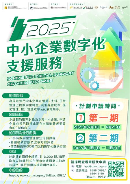 有意申請企業可掃描海報二維碼或前往網址(https://www.cpttm.org.mo/smetech2025/)了解詳情、瀏覽認可供應商的方案並提交申請。如有查詢,請於辦公時間內致電6264 6159/8898 0899或電郵至ispu@cpttm.org.mo,與生產力中心戴先生或鄭小姐聯絡。
