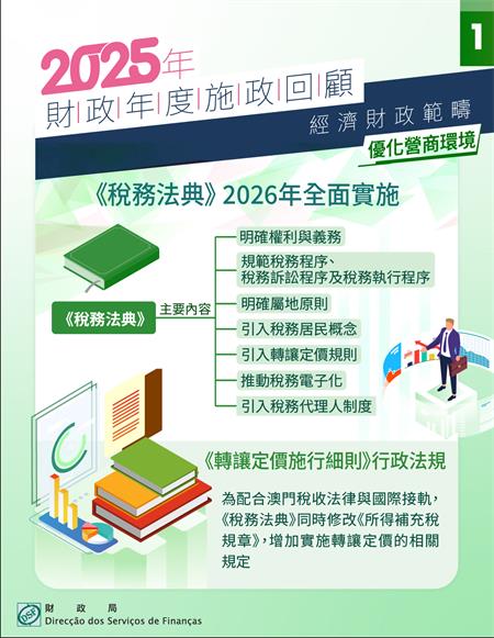 法典的全面實施是優化營商環境的重要舉措,為配合澳門稅收法律與國際接軌,法典亦同時修改《所得補充稅規章》,增加實施轉讓定價的相關規定;2025年8月15日,《轉讓定價施行細則》行政法規獲行政會通過,將於2026年1月1日生效;財政局亦於2025年10月下旬舉辦兩場《轉讓定價施行細則》講解會,向企業、法律及會計專業界別講解細則內容,有助各持份者對上述行政法規的生效作出充分準備。