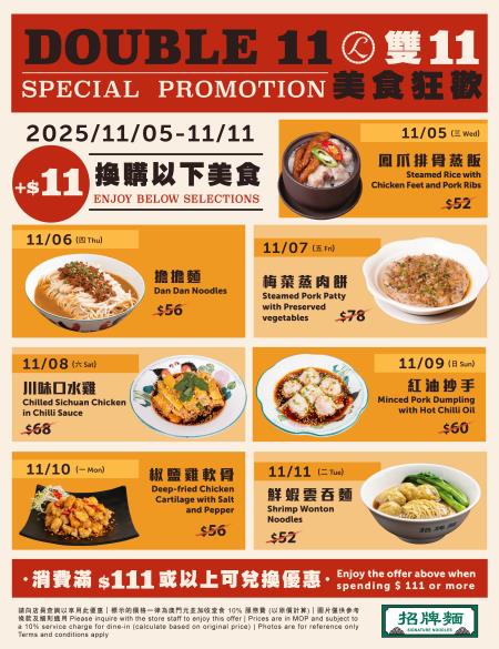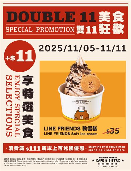 “美食狂歡雙十一”連續七日為饕客帶來味蕾驚喜。“燊哥冰室”主推經典懷舊冰室美食,澳門幣11元驚喜價可換購一款美食包括:葡撻(兩件)、咖哩珍寶魚蛋、澳門特色炸豬扒脆包、炸魚柳配薯條、雞絲碗仔翅、楊枝甘露及朱古力法式西多士;“招牌麵”主打粵式經典家常菜與川味佳餚,優惠換購一款美食包括:鳳爪排骨蒸飯、擔擔麵、梅菜蒸肉餅、川味口水雞、紅油抄手、椒鹽雞軟骨及鮮蝦雲吞麵;“BROWN & FRIENDS CAFE & BISTRO”則推出特選LINEFRIENDS軟雪糕,以萌趣創意甜品為節日增添甜蜜驚喜。