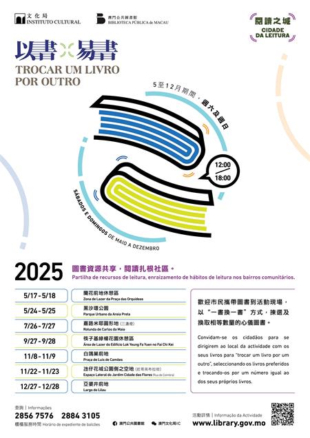 新增場次將於11月8日及9日在白鴿巢前地、12月27日及28日在亞婆井前地舉行,連同早前已公佈的11月22日及23日在氹仔花城公園旁空地之場次,各場活動時間為中午12時至下午6時。活動採取“一書換一書”形式,參加者只需攜帶符合換書規則的書籍前往現場,經工作人員確認後,即可挑選並換取等量的心儀圖書。現場亦設澳門公共圖書館服務展板,方便市民瞭解各項圖書館資源與服務。