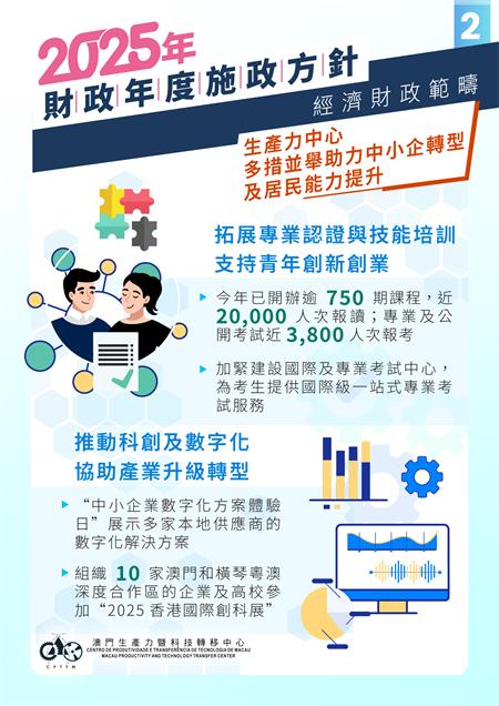 【本報訊】為落實2025年施政報告提出支持中小企業持續經營、創新發展和提升經營能力,並鼓勵居民考取國家及國際認可的專業及職業資格的工作,澳門生產力暨科技轉移中心(下稱“中心”)從兩大方向推動相關工作,一是協助企業,尤其是中小企業,取得認證和數字化轉型;二是為居民提供技能培訓及專業考試,培育各行業所需人才。