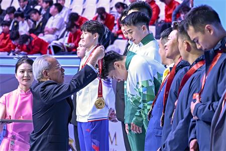 澳門賽區承辦的十五運會空手道項目今日率先拉起帷幔,岑浩輝一行視察綜藝館比賽場地的同時,亦觀看了男子業餘組團體型的銅牌賽和決賽,感受全運氣氛,為選手們鼓勁。賽後,岑浩輝頒發獎牌予賽事的金、銀、銅牌得主,並向澳門特區代表隊致賀,恭喜本澳運動員在十五運會澳門賽區首項賽事就能奪得首面金牌。他表示,澳門運動員的表現充滿朝氣與拼勁,體現“活力澳門”的精神。他勉勵本澳運動員,要把握與全國好手競技的機會,超越自我、收穫友誼,充分發揮體育精神。