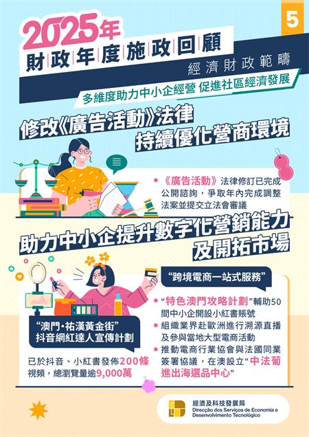 【本報訊】為落實2025年施政報告中關於持續優化營商環境,促進社區經濟發展的目標,特區政府採取多方面措施,助力本澳企業提升管理效率和競爭力,並引入不同元素增添社區吸引力,加強宣傳推廣,為社區拓流引客帶動消費。同時提供不同的財政支援措施,支持中小企業持續經營及創新發展。