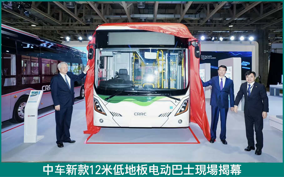 展會現場,國務院國資委黨委委員肖宗輝、南光集團董事長傅建國和中國中車總經濟師譚沐共同為中車新款12米低地板電動巴士現場揭幕,搭載高效節能動力系統,靜音、爬坡性能、能耗表現優異,並以人性化的設計為行動不便者上下車提供了便利。