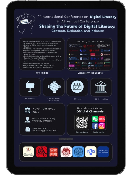 【本報訊】為推動跨學科研究與國際對話,澳門大學人文社科高等研究院將於11月19至20日舉行第一屆數字素養國際會議暨第五屆高研院周年學術研討會,匯聚全球逾50位專家學者,圍繞“塑造數字素養的未來:概念、評估與包容性”的主題,以實證研究、理論探討與政策分析為基礎,進行批判性對話和合作探究,推進以包容性和倫理為基礎的數字未來。歡迎有興趣人士參加。