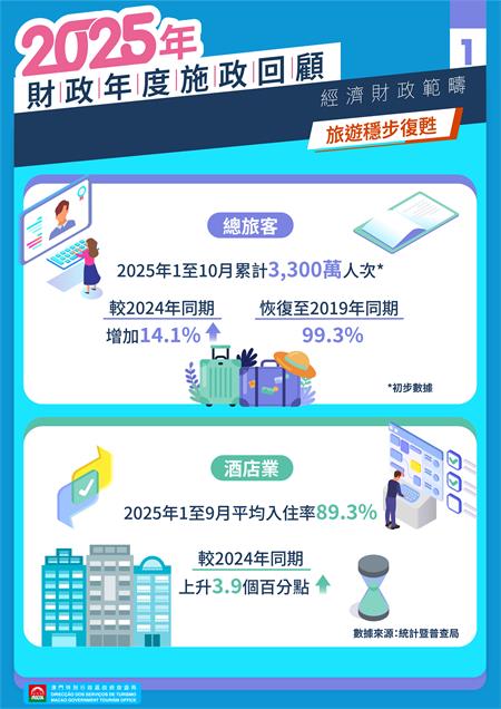初步數據顯示,2025年1至10月,澳門入境旅客累計3,300萬人次,同比增長14.1%,恢復至2019年同期的99.3%。國際旅客持續增長,達215萬人次,同比上升13.6%。國慶“黃金周”期間,日均入境旅客14.3萬人次,10月4日單日更高達19.1萬人次,均創下歷年國慶假期新高。酒店業表現理想,1至9月平均入住率為89.3%,同比上升3.9個百分點。