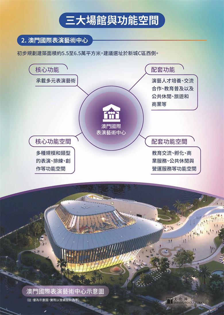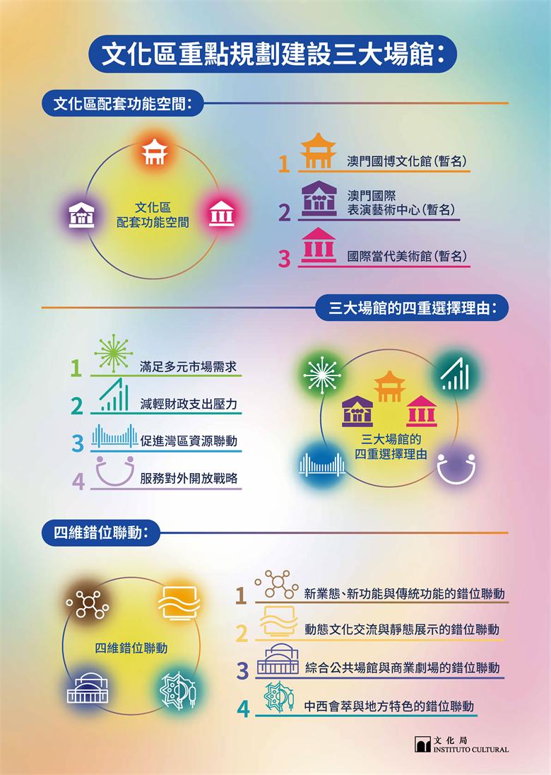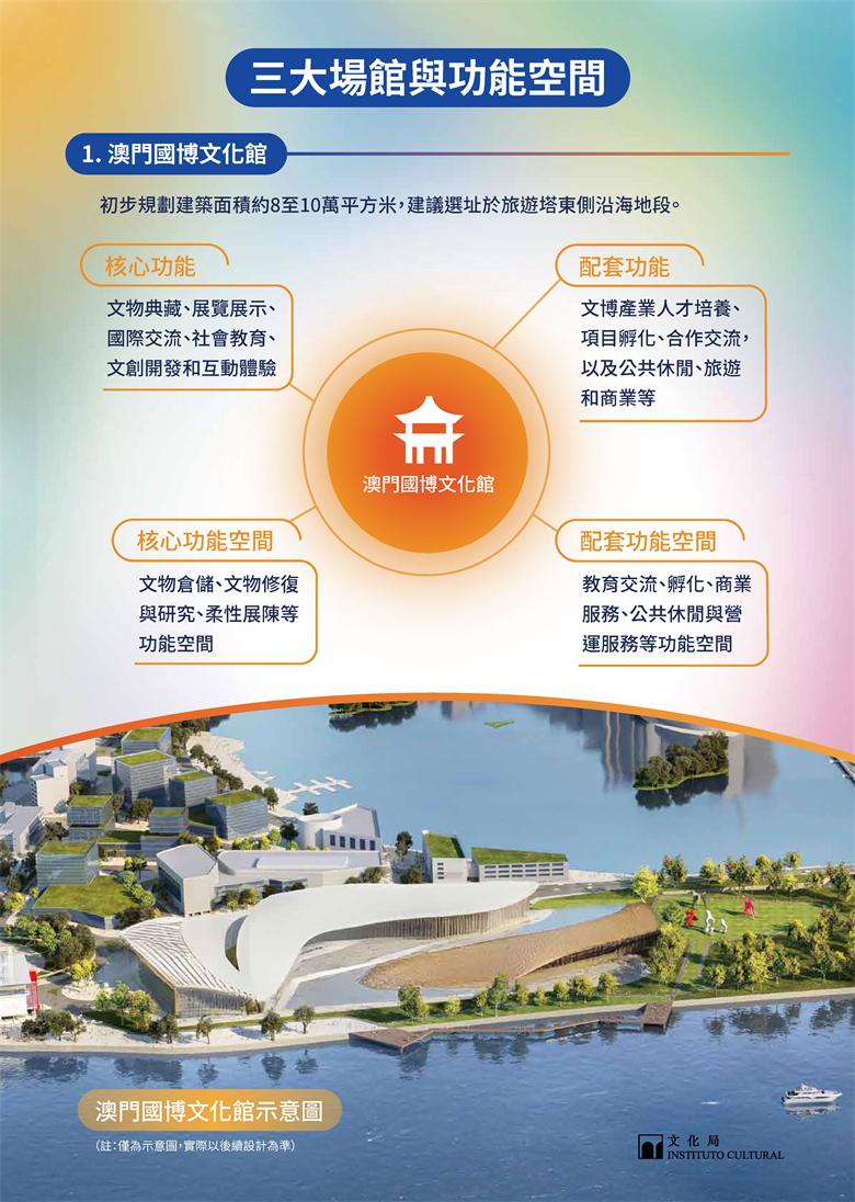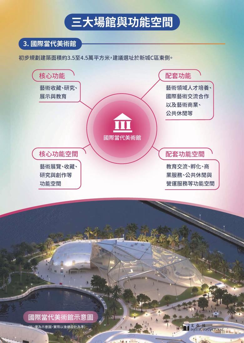澳門國博文化館擬建成澳門規模最大的博物館,以文物典藏及展覽展示等功能為核心,提供高水平展覽、研學教育及修復研究等多元功能空間;澳門國際表演藝術中心將以承載多元表演藝術為主軸,集成人才培養與交流合作等配套功能,為觀眾提供豐富的演藝體驗,亦為演藝機構及藝術工作者提供展演、創作與交流的平台。國際當代美術館將以藝術收藏、研究、展示與教育為核心,兼顧人才培養、國際交流及藝術商業配套等功能,為公眾提供高品質的藝術體驗,同時為藝術從業者提供創作研究平台。