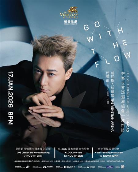 【本報訊】香港藝人林峯將於2026年1月17日登陸澳門威尼斯人®的威尼斯人綜藝館,舉辦“GOWITH THE FLOW林峯世界巡迴演唱會澳門站”。演唱會門票將於2025年11月17日(星期一)中午12時起透過金光票務、澳門售票網及大麥網公開發售。