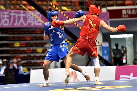 武術散打古曉嵐(KU HIO LAM)(藍方)與對手駁拳