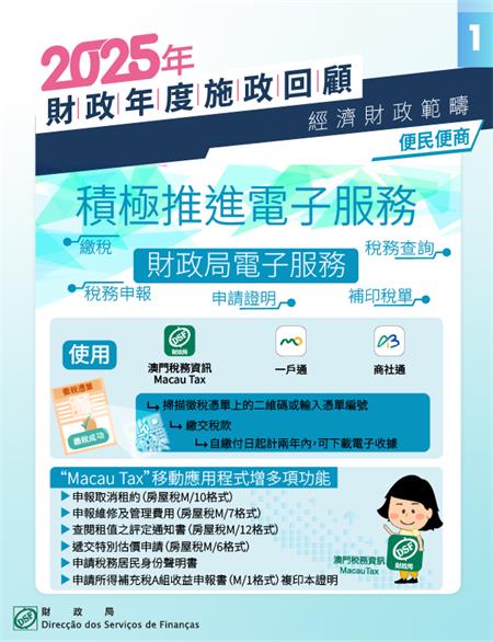 財政局並持續優化“澳門稅務資訊Macau Tax”移動應用程式,推出多項功能,包括:“申報取消租約(房屋稅M/10格式)”、“申報維修及管理費用(房屋稅M/7格式)”、“查閱租值之評定通知書(房屋稅M/12格式)”、“遞交特別估價申請(房屋稅M/6格式)”、“申請稅務居民身份聲明書”以及“申請所得補充稅A組收益申報書(M/1格式)複印本證明”。