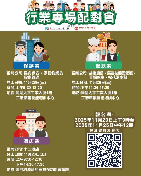 11月26日上午保潔業專場配對會及同日下午餐飲業專場配對會均在關閘馬路101-105A號太平工業大廈第一期一樓舉行;11月28日全日酒店業專場配對會在澳門利澳酒店三樓多功能會議廳舉行。報名日期由明(20)日上午9時至11月25日中午12時。