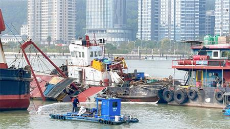 由於傾側漁船漏出少量油污,海事及水務局啟動防溢油機制,佈置吸油條,現已完成清理。