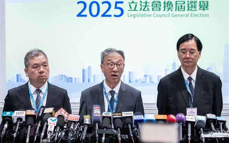 12月8日淩晨,香港特區選舉管理委員會主席陸啟康(中)等在位於香港會議展覽中心的中央點票站新聞中心會見記者,介紹香港特區第八屆立法會選舉的投票情況。 中新社記者 侯宇 攝