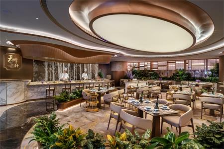 嶄新的美食殿堂天峰軒星際以亮白大理石為主要裝飾,營造明亮觀感,優雅無瑕。綴以深色大理石作襯托,劃出主要入座空間。天花以燈光透射出花草圖案,映照著座位區正中央隨季節轉換色彩的室內盆景,帶上一抹大自然的氣息。