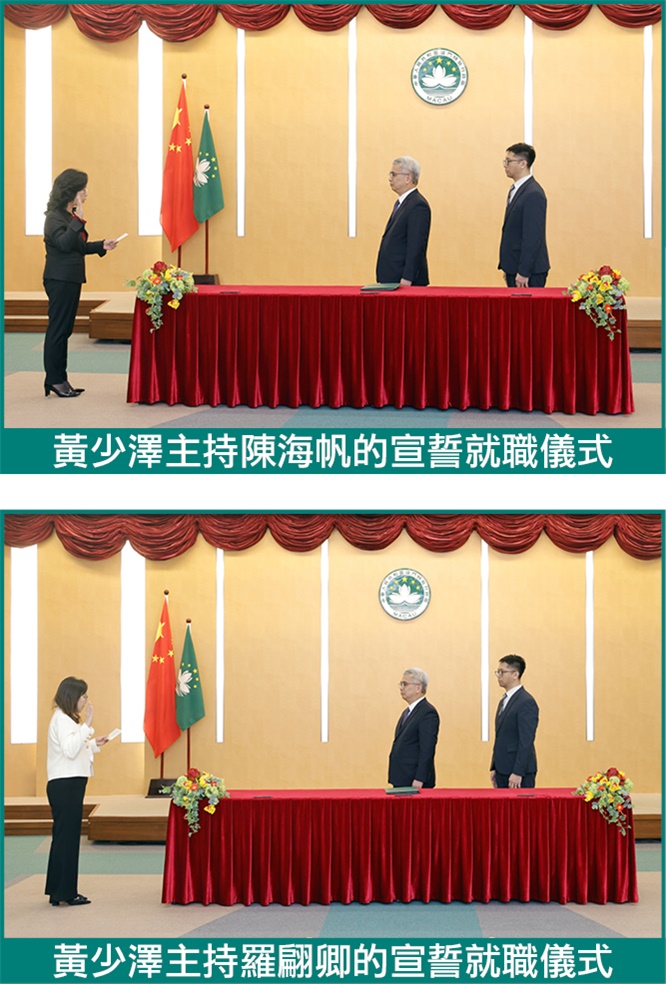 【本報訊】行政法務司司長黃少澤17日早上在政府總部多功能廳,主持身份證明局局長陳海帆和法律及司法培訓中心主任羅翩卿的就職儀式,黃司長充分肯定兩人具備豐富管理經驗與優秀領導才能,展現大局意識和執行能力,堅信兩人能帶領團隊開拓創新,全力推進公共行政改革,實現第六屆特區政府“提升特區治理效能”的施政目標。