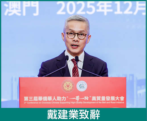 戴建業致辭表示,期望通過大會進一步凝聚僑心、匯聚僑智、發揮僑力,並讓更多僑界朋友親身感受澳門以至粵港澳大灣區的活力,將“澳門平台”轉化為全球機遇,共同參與“一帶一路”高質量發展,為構建人類命運共同體作出新的更大貢獻!