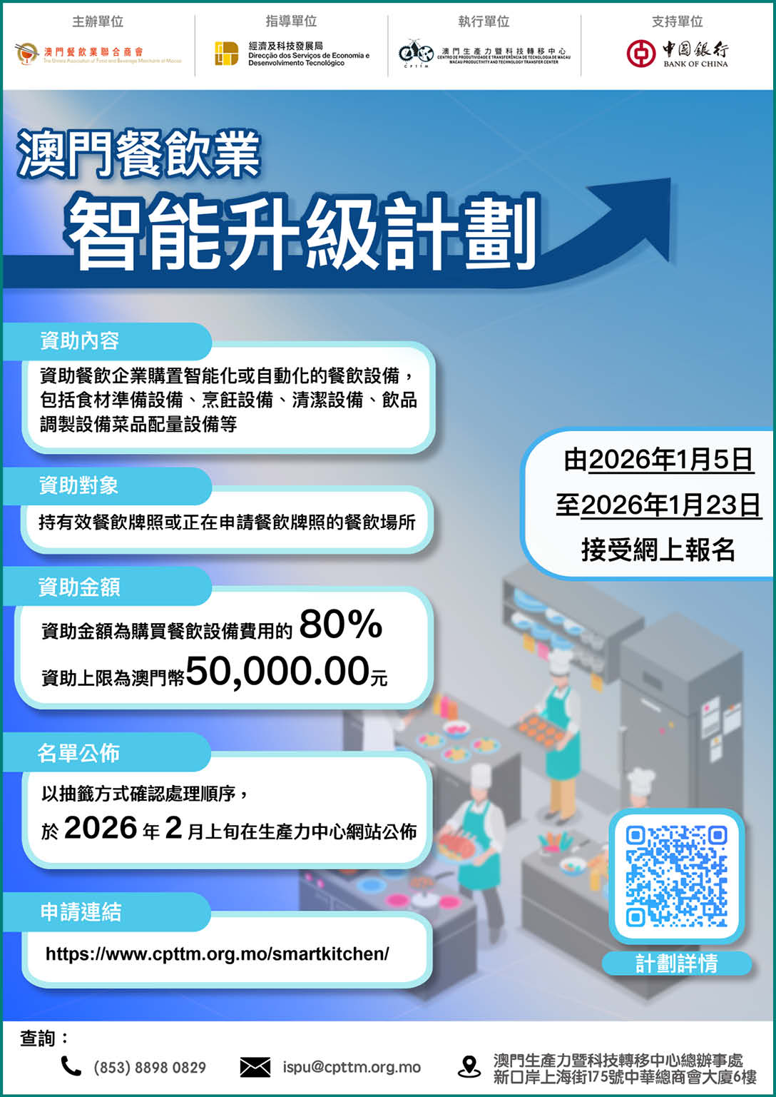 計劃的章程、申請流程、設備清單及供應商列表等資訊,可於以下專頁(https://www.cpttm.org.mo/smartkitchen/)查閱。如有任何疑問,可電郵至ispu@cpttm.org.mo,亦可於辦公時間致電8898 0829或親臨生產力中心總辦事處(新口岸上海街175號中華總商會大廈6樓)與戴先生聯絡。