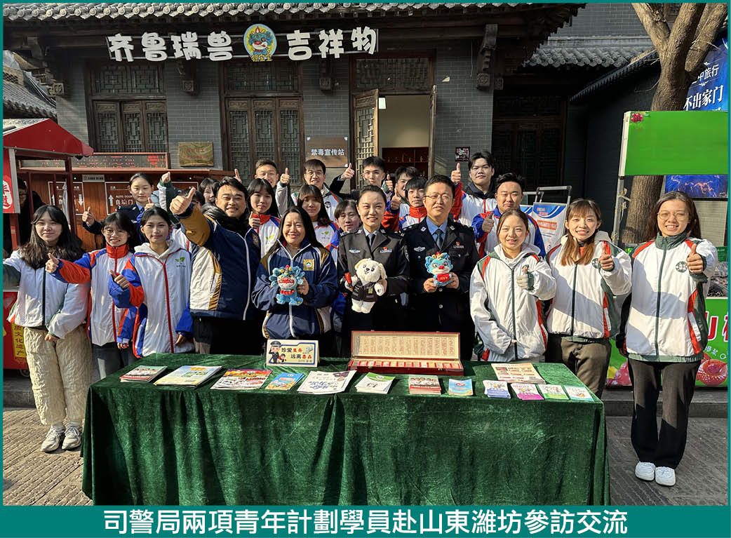 司警局與濰坊市公安局長期保持緊密合作,尤其在青少年防罪教育領域持續交流互動。近年來,司警局“社區安全青年領袖計劃”及“滅罪小先鋒種子計劃”學員,多次與濰坊公安局少年警校“平安小先鋒”攜手開展預防濫藥宣傳活動,透過同儕互動提升防罪教育成效。