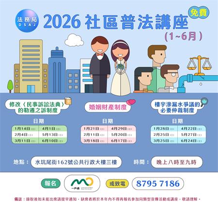 2026年法務局社區普法講座可透過一戶通或電話進行報名