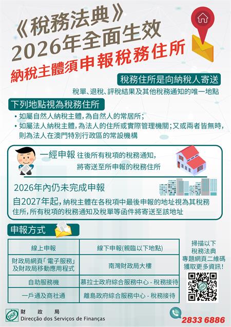 【本報訊】為配合《稅務法典》的生效,納稅主體須按法律規定於202611日至1231日期間,向稅務行政當局申報稅務住所。稅務住所是用於稅務行政當局向納稅人寄送如稅單、退稅、評稅結果及其他稅務通知的唯一地點。