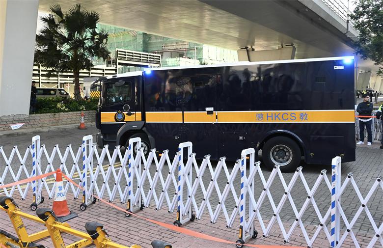 2026年1月12日起,反中亂港分子黎智英與蘋果日報3家公司涉嫌違反香港國安法等案件進入求情程序。圖為2025年12月15日,押送黎智英的懲教署車輛離開香港特區西九龍法院大樓。 中新社記者 李志華 攝