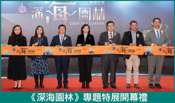 【本報訊】由澳門科學館、上海科技館及同濟大學共同主辦,香港中文大學與世界自然基金會香港分會協辦,並獲中國大洋事務管理局支持的《深海園林》專題特展,1月16日在澳門科學館展覽中心開幕。主禮嘉賓包括:澳門科學館董事長穆欣欣、上海科技館黨委書記姜道榮、同濟大學深海科學科普基地館長黃維副教授、香港中文大學生命科學學院助理教授佩怡、世界自然基金會香港分會梁恩銘總監。澳門科學館股份有限公司。展覽以2018年在南海深處首次發現的“冷水珊瑚林”為核心,融合科技前衛與藝術造景,為大眾開啟一場探索深海奧秘的沉浸之旅。