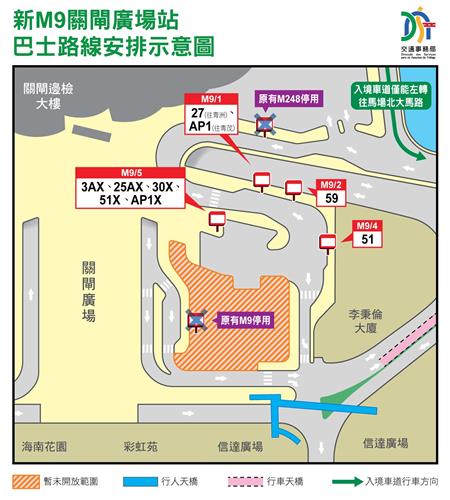 “關閘廣場”站與“關閘東側上落客區”站合併,並遷移至新建的原特警總部上落客區內,停靠路線包括:3AX、25AX、27(往青洲)、30X、51、51X、59、AP1(往青茂)及AP1X。