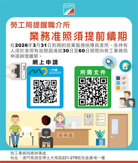 【本報訊】按照第16/2020號法律《職業介紹所業務法》規定,在2026331日到期的就業服務指導員准照,各持有人須於准照有效期屆滿前30日至60日期間(即由2026131日起)向勞工事務局(下稱“勞工局”)申請辦理續期。倘少於30日前提出,須額外繳付多1倍續期費用;另倘有效期屆滿前仍未提出,准照會被註銷。因此,准照持有人務必於法定期間內提出續期申請及提交所需的申請文件。辦理續期可透過一戶通提交申請或以紙本方式提交。